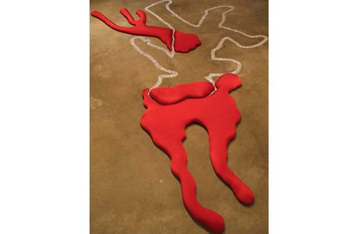 Upholstered pools of blood, shimmering and glittering outlines of unidentified bodies, spent weapons strewn on the floor… Aftermath presents a considerable development in Fisher’s practice. New pieces, beautifully crafted in fabric, adorn Studio Voltaire’s floor and ceiling – the former gothic style chapel is transformed. While individual details seem to reference avant-garde design, the overall impression is that of the latest media disaster, or is it a film set? Kill Bill meets South Park, The Shining via The Wizard of Oz and then back again through Bowling for Columbine? Fisher has delicately created an aftermath of multiple pop cultural references. Familiarity, confused by representational play, recedes and we are left with a nightmarish playground of soft things to consider.