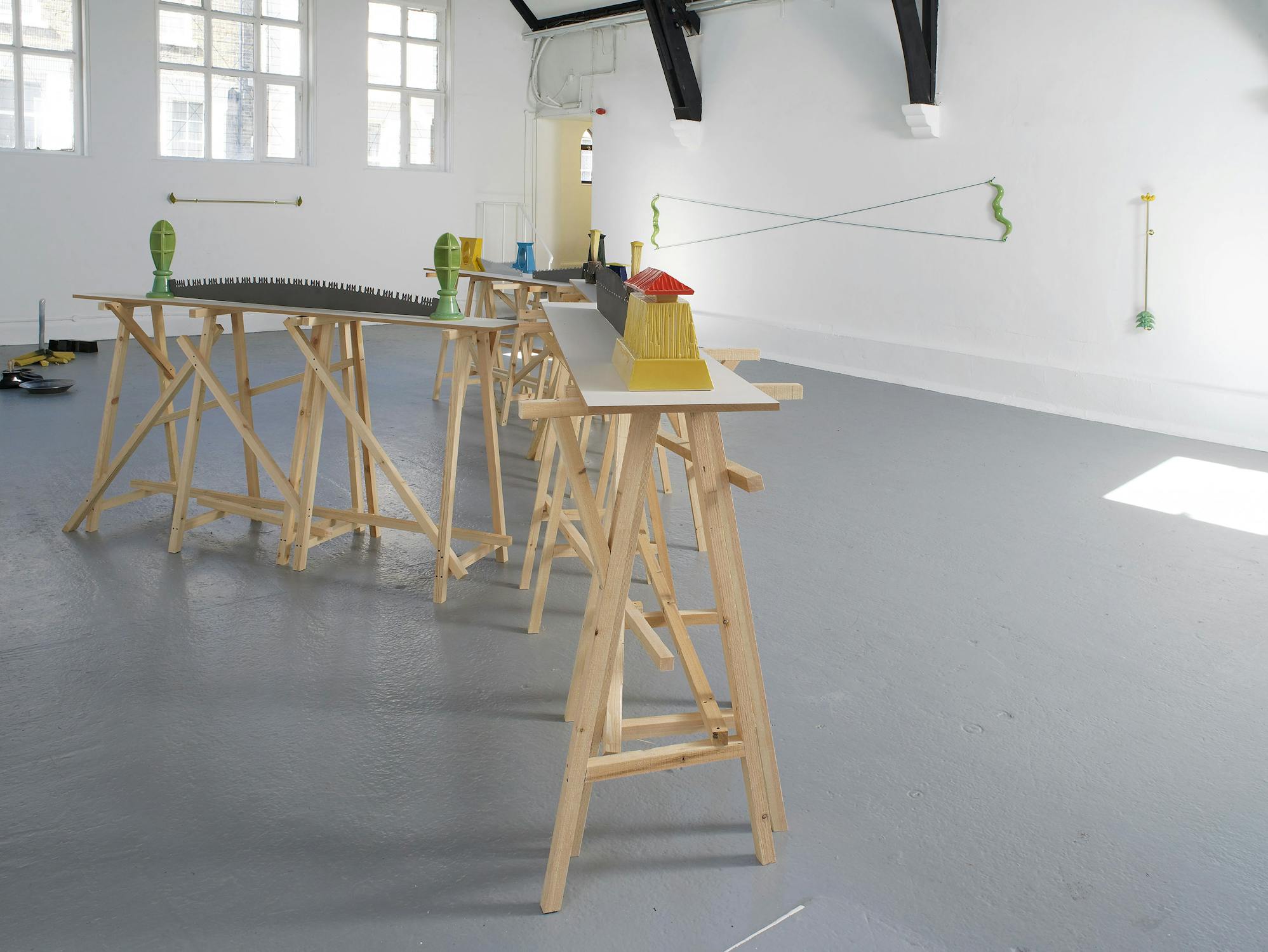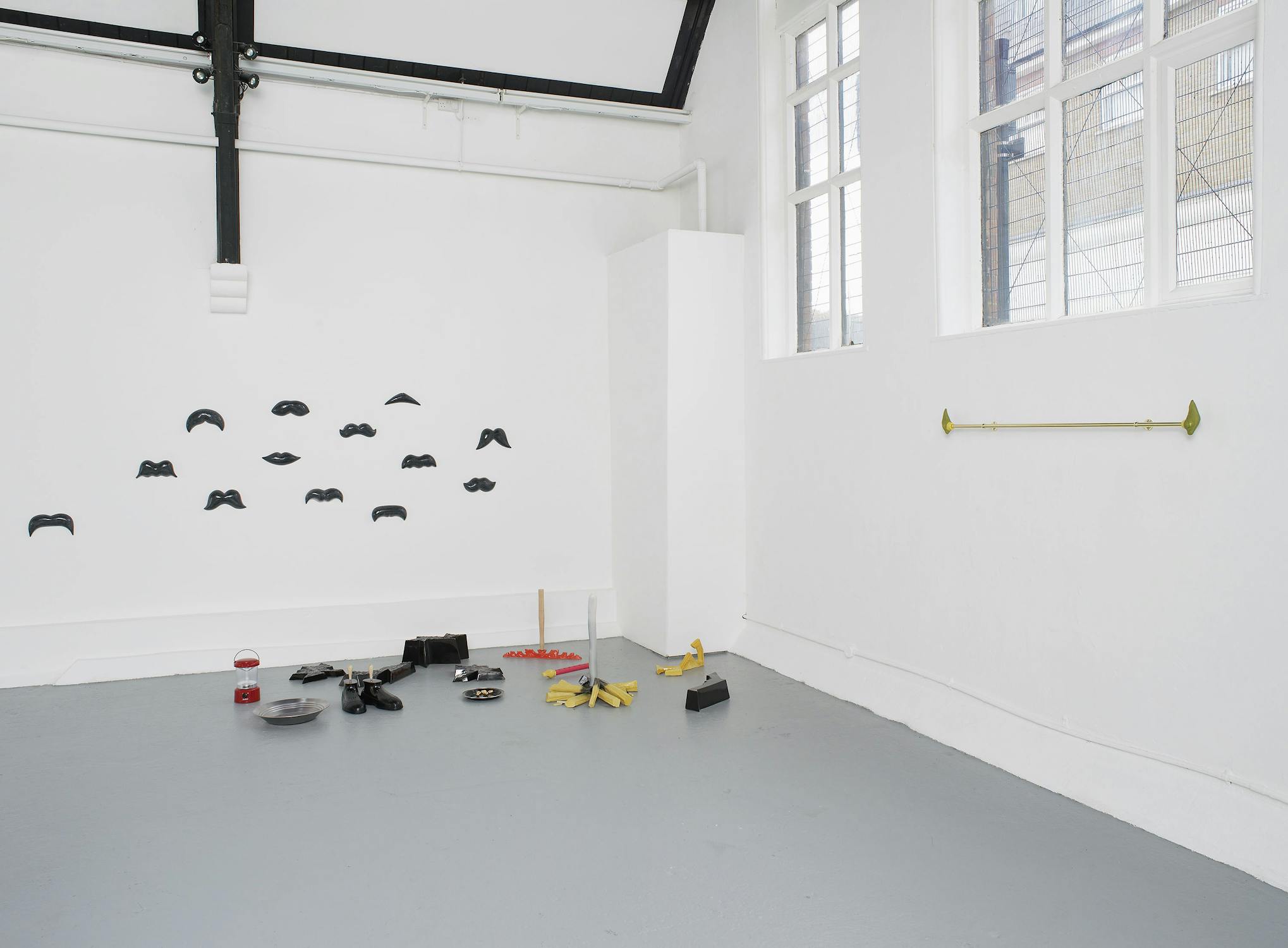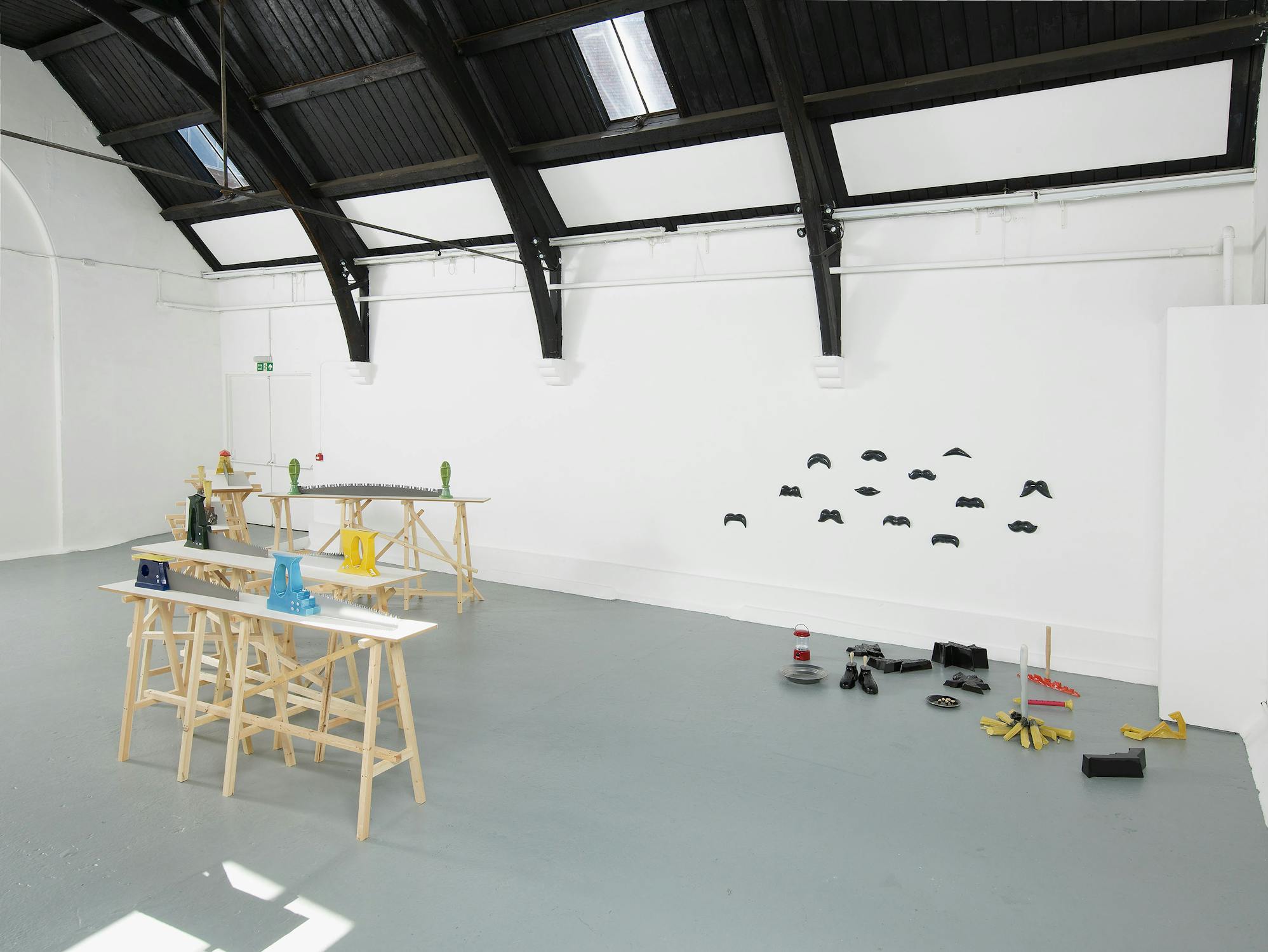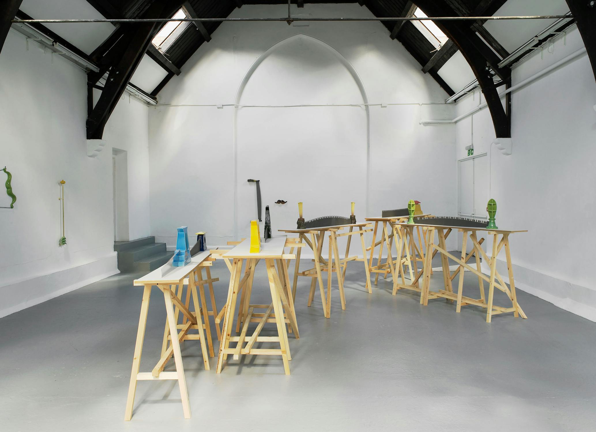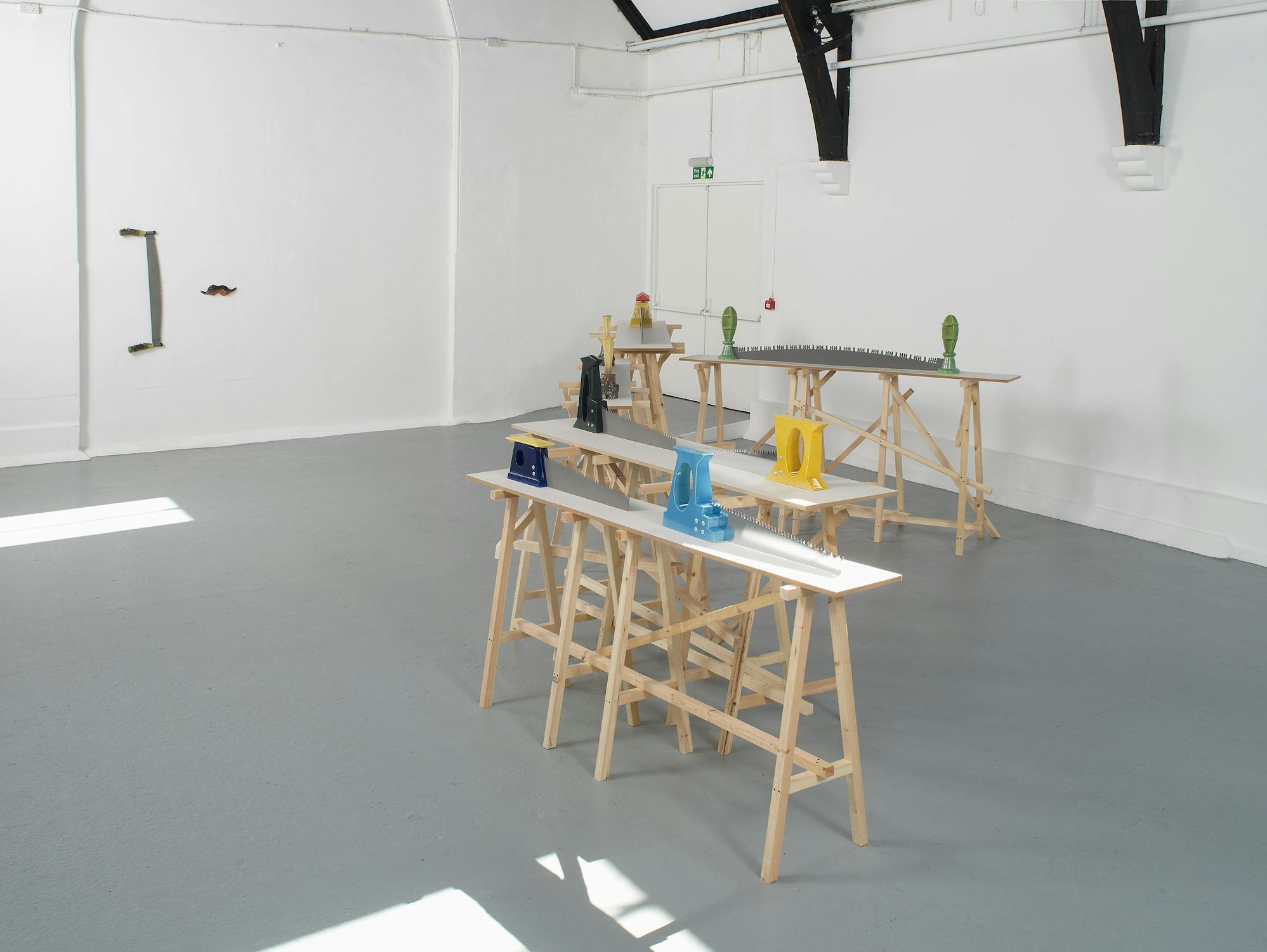 Central to Slee’s exhibition at Studio Voltaire were a number of works based on vernacular objects such as: wood saws, hammers, pick axes and camping equipment. Inspired by a residency at Alfred University, upstate New York, the works investigated particular myths surrounding the symbolism of America as a land of the great outdoors and pioneer spirit. Lashed together workbenches, scattered tools and an abandoned camp-fire transform into an allegory of abandoned industry.