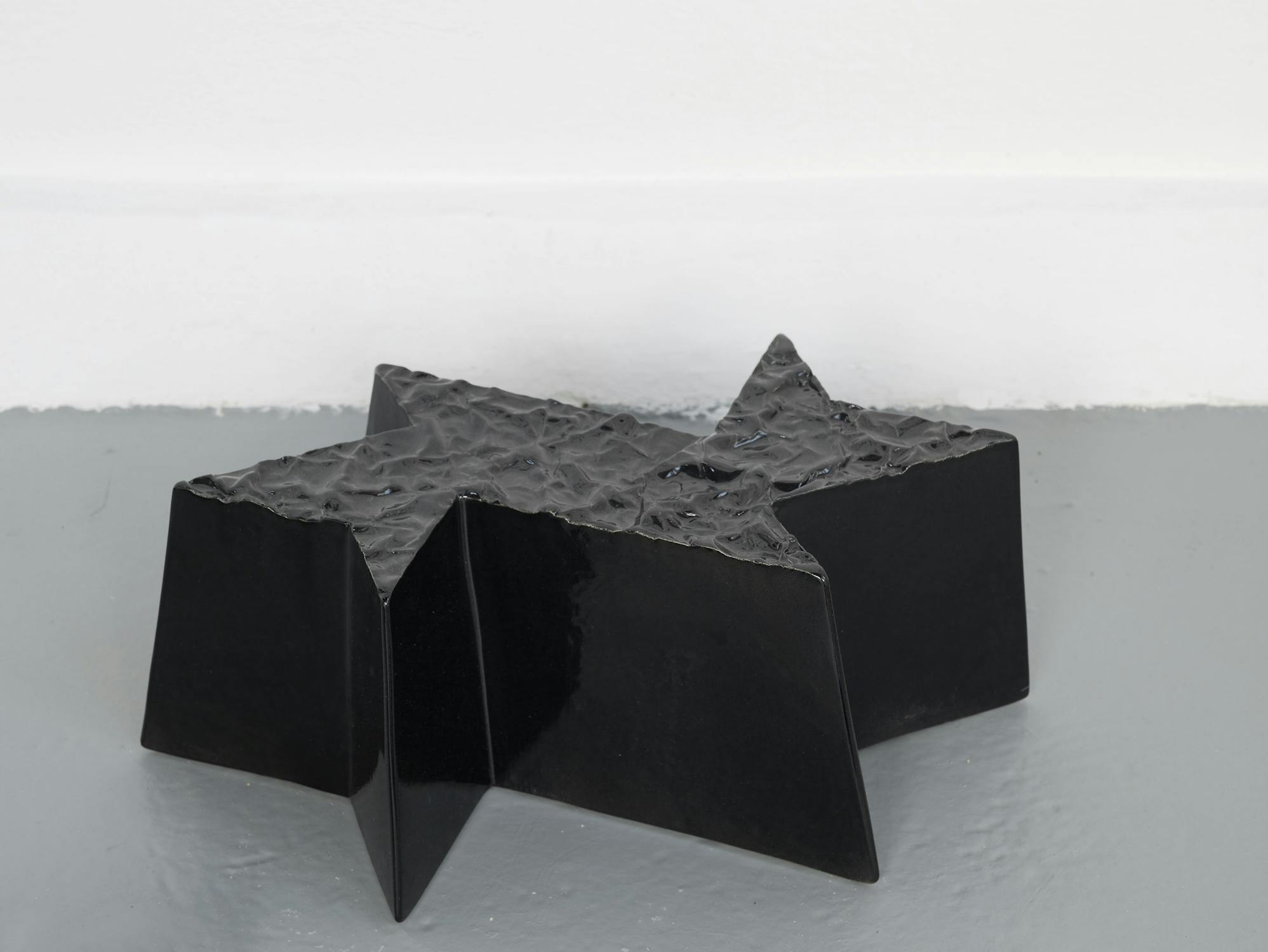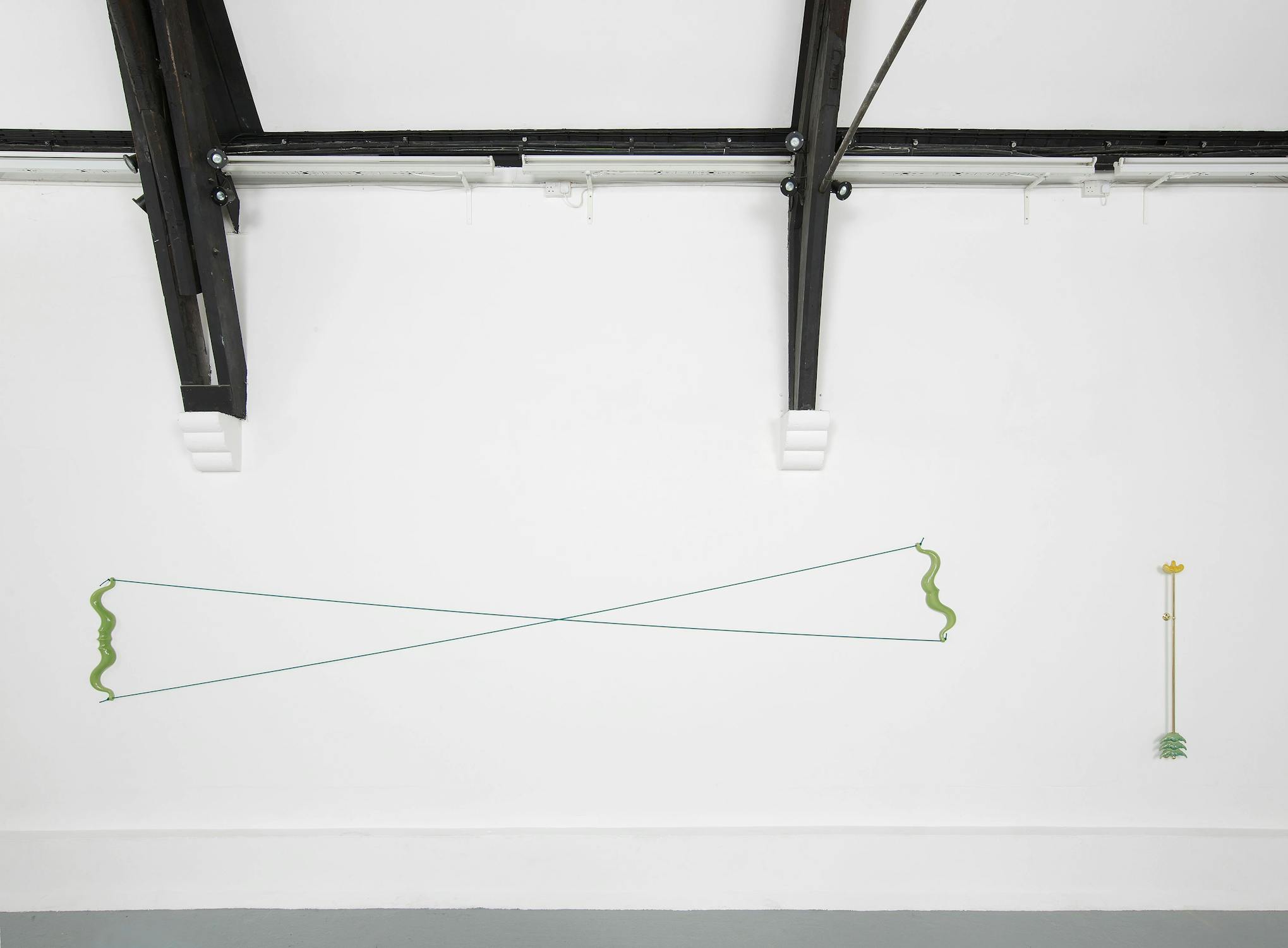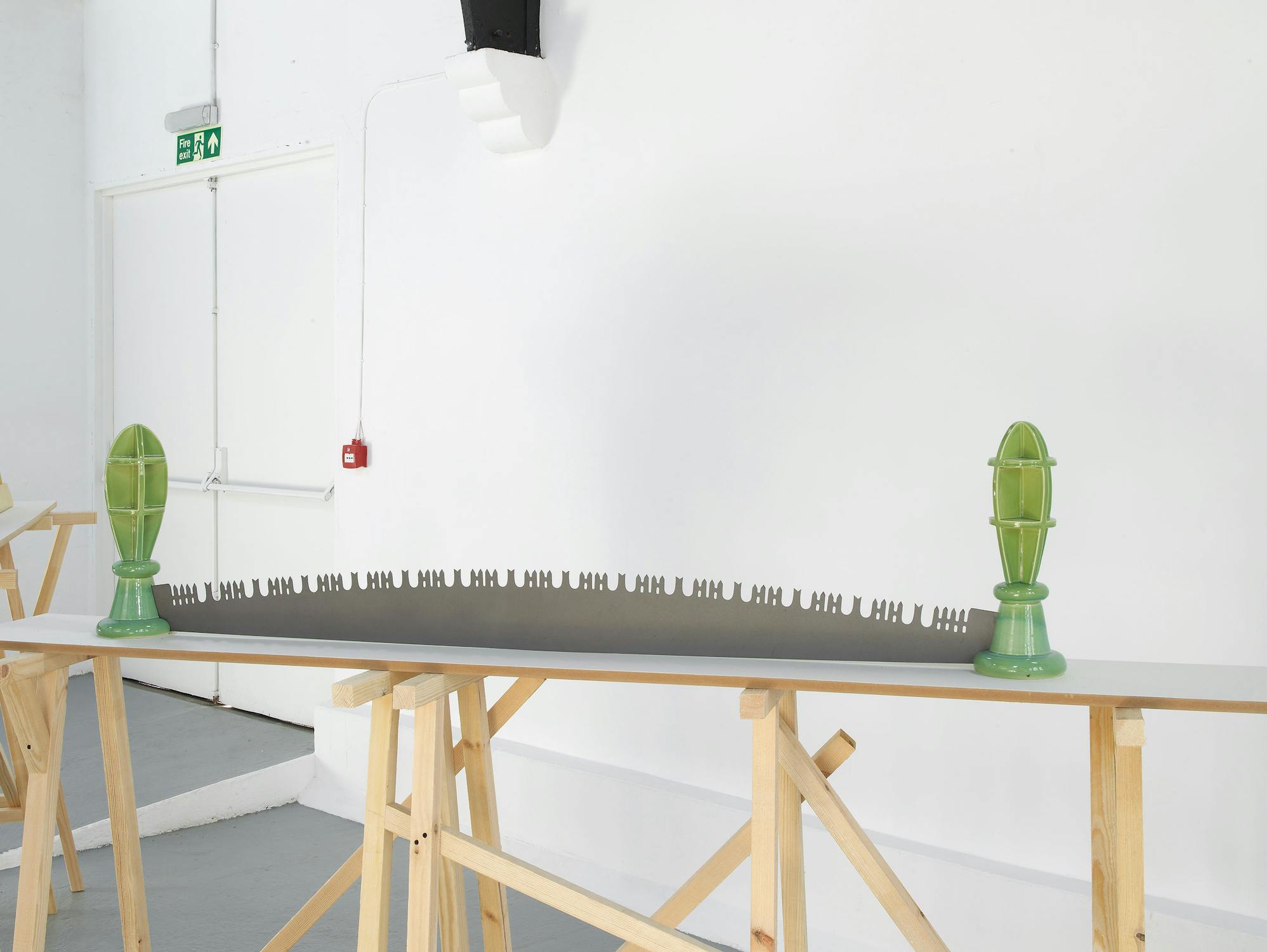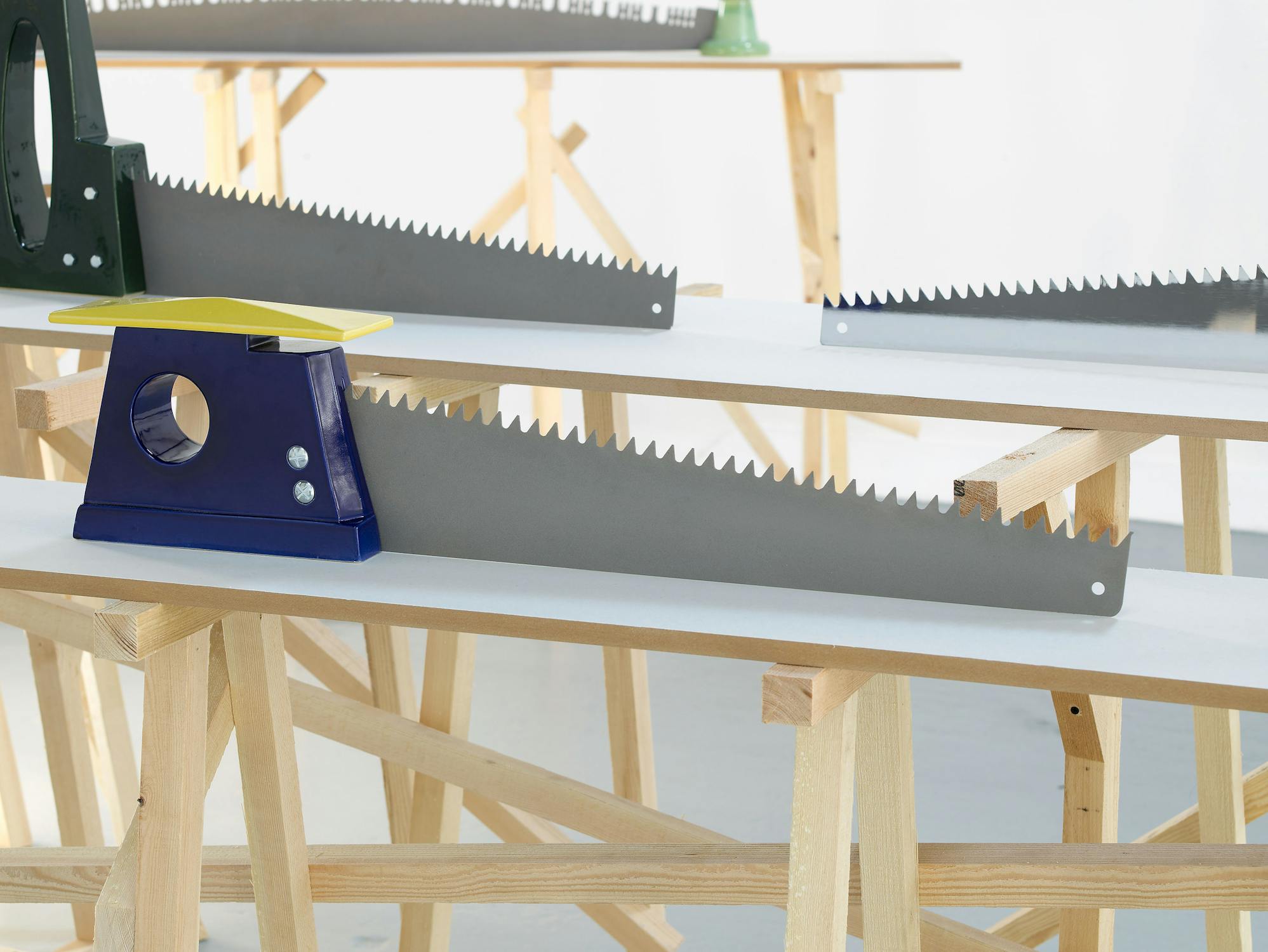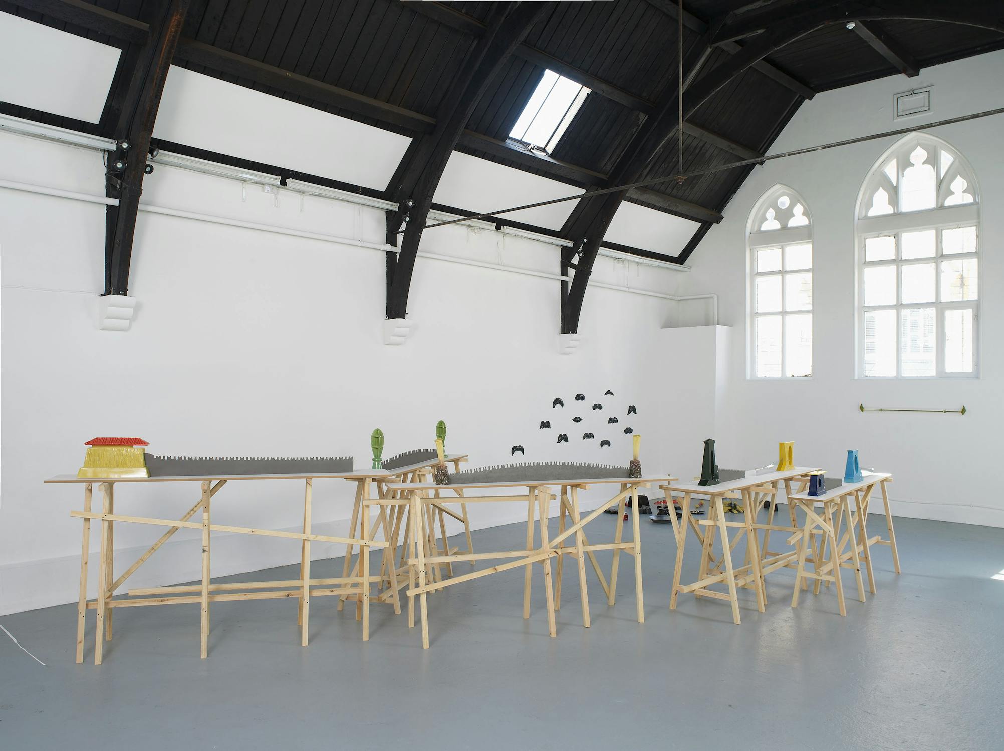 Central to Slee’s exhibition at Studio Voltaire were a number of works based on vernacular objects such as: wood saws, hammers, pick axes and camping equipment. Inspired by a residency at Alfred University, upstate New York, the works investigated particular myths surrounding the symbolism of America as a land of the great outdoors and pioneer spirit. Lashed together workbenches, scattered tools and an abandoned camp-fire transform into an allegory of abandoned industry.