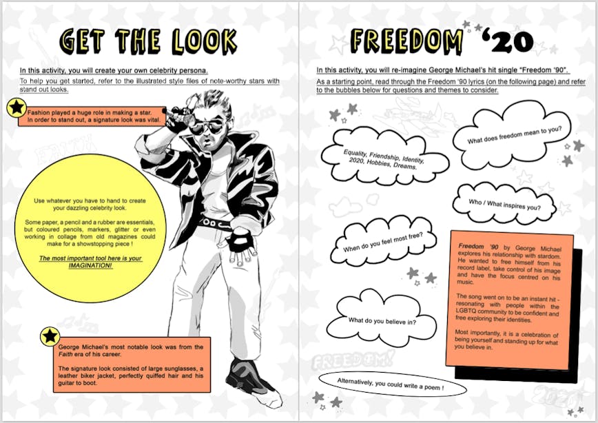 Morton-Abuah responded to the brief with Making a Star, two activities that explore George Michael through portraiture, music and song-writing and include Morton-Abuah’s iconic illustrated ‘style files’ of Michael and his contemporaries. Morton-Abuah was inspired by George Michael’s relationship with celebrity, and his core values of standing for what you believe in, to create the pack.