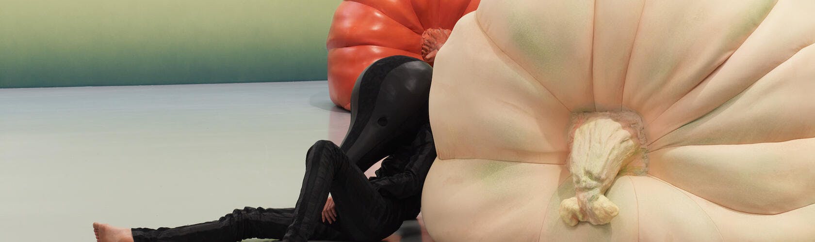 I think now is a good time to ask you about some of the individual motifs, because of course they are sort of woven through your work, and they repeat. They are constantly changing depending on the context of the work, but I think it would be good to just really drill down into some of them, and talk a bit more about them individually. We can begin, I mean, with any of them but one I wanted to begin with was the squash, which has also obviously been the title of the Duveen 2018 Tate Britain installation. And also, and you can see it in the images behind us, the way that that takes the guise as a kind of sculpture but also as costume and performance. Could you talk more about that?