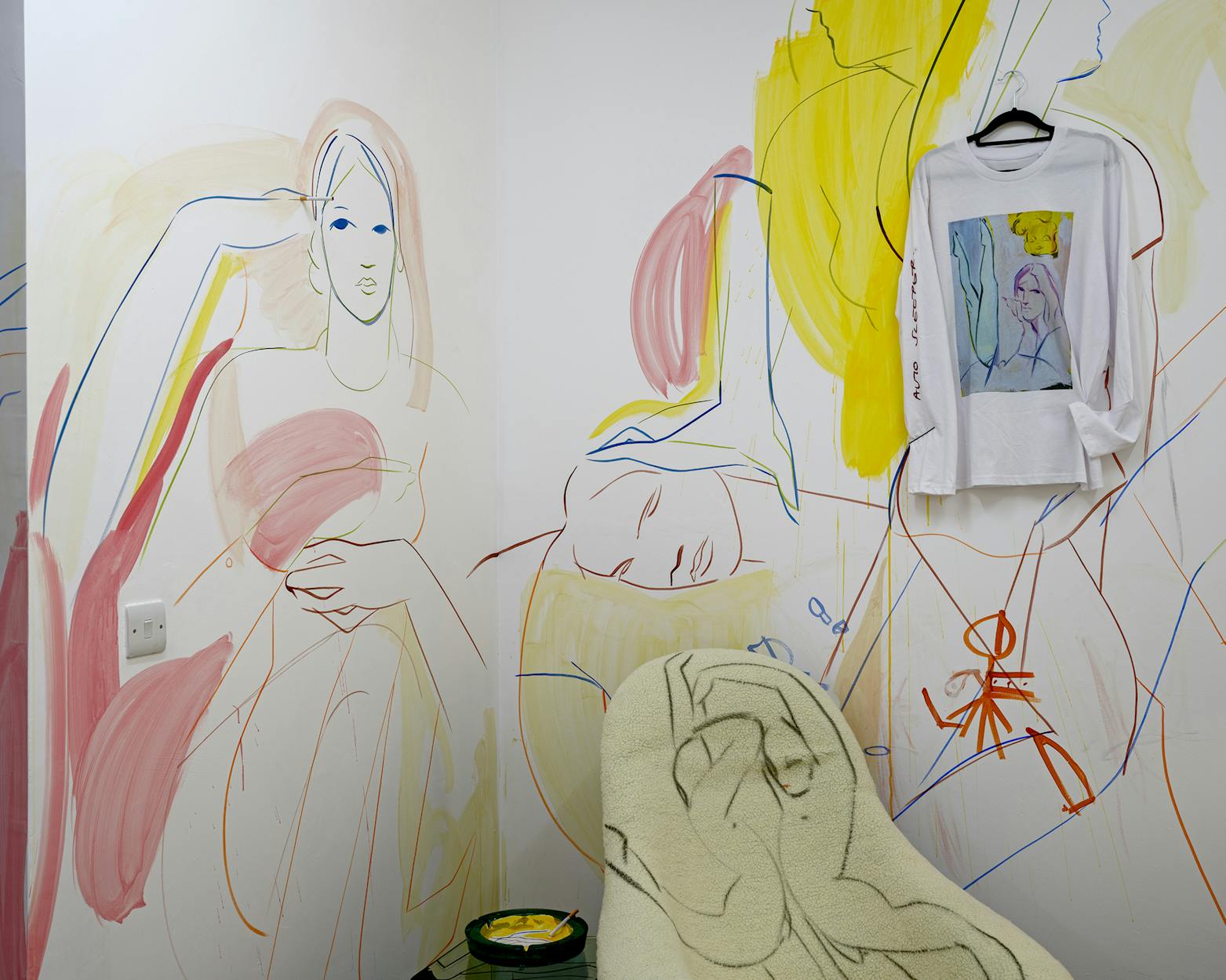 In this new vivid installation, France-Lise McGurn (b. Glasgow 1983) invites visitors into an imagined domestic space that is tinged with the minds and musings of recently departed party guests. Known for her unrestrained fluid paintings, McGurn’s atmospheric figurative gestures deliver a wholly immersive experience into a three-dimensional world of the intimate and relatable.