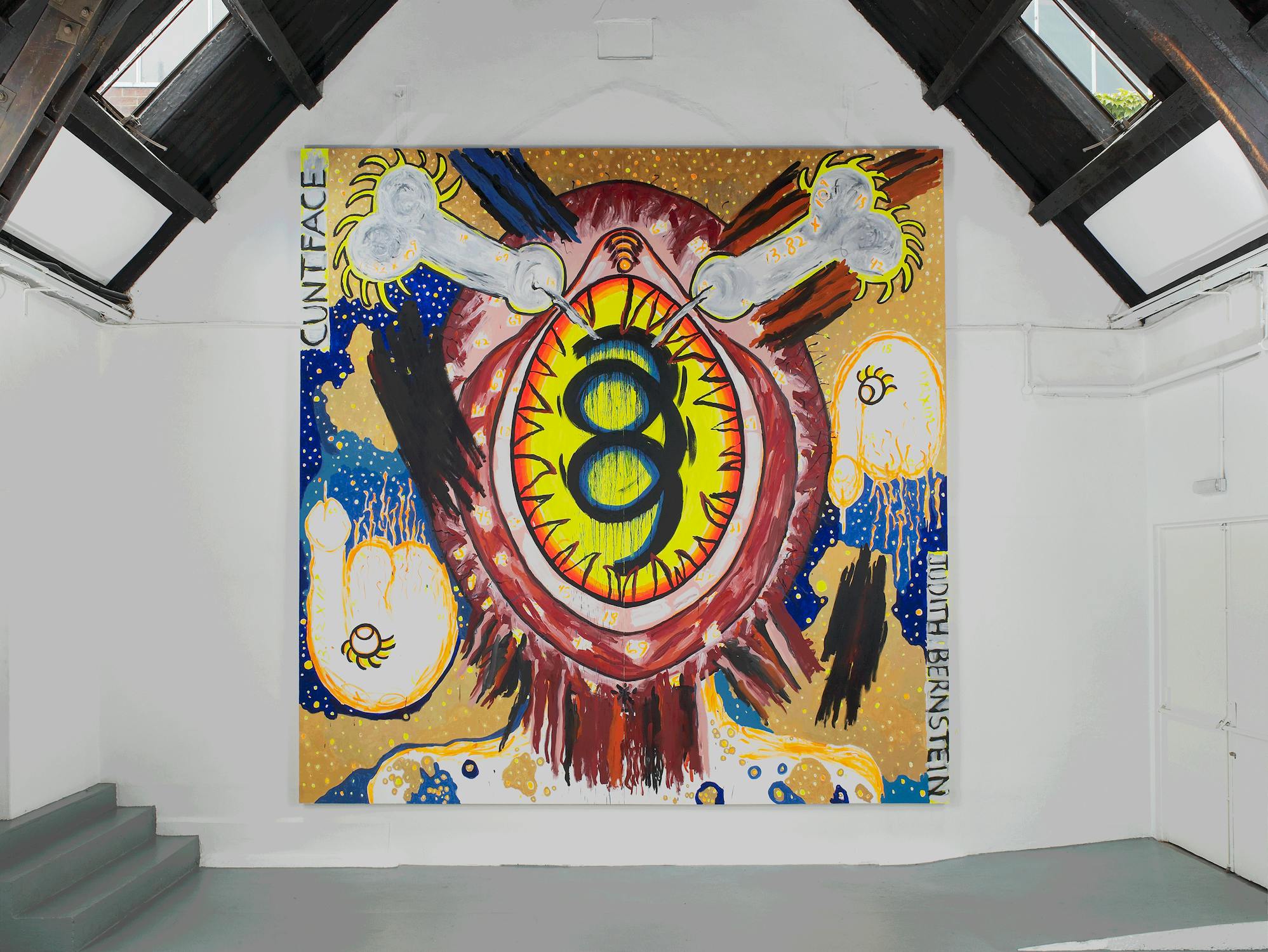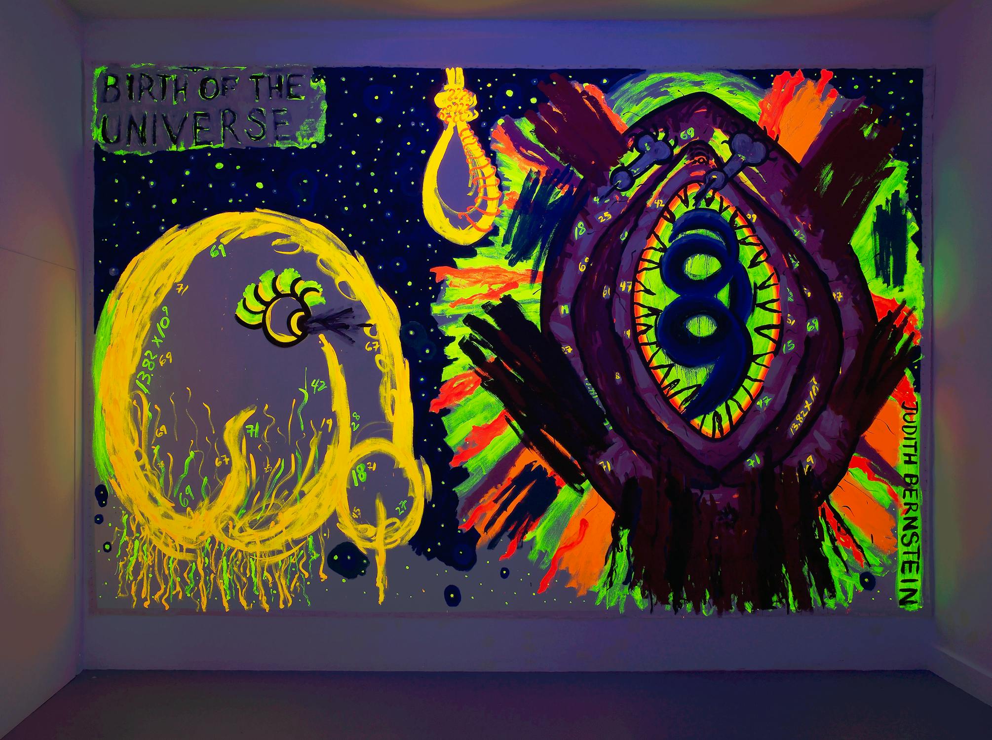 Bernstein’s expressive practice embodies the psychological amalgamation of sex, violence and feminism, in varying orders and priorities. Birth of the Universe is a recent series of expressive paintings made using oil and fluorescent paint exploring the chaos, violence, and the nuclear explosion that was The Big Bang. She probes the origin of space, time, and infinity, using the rage of the “active cunt” as the primal source in the expanding universe. These paintings delve into issues regarding relationships and gender with a literal dialogue between the “active cunt” and the phallus.