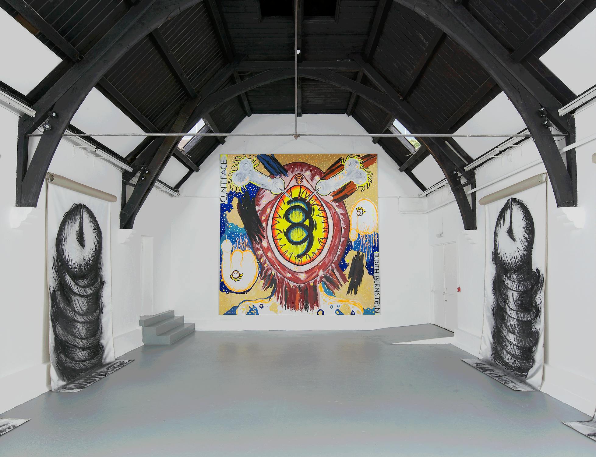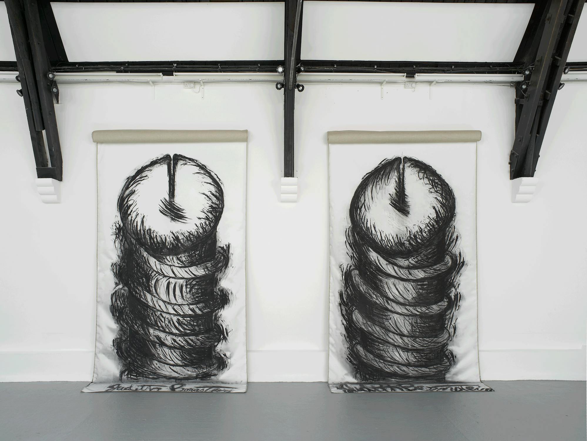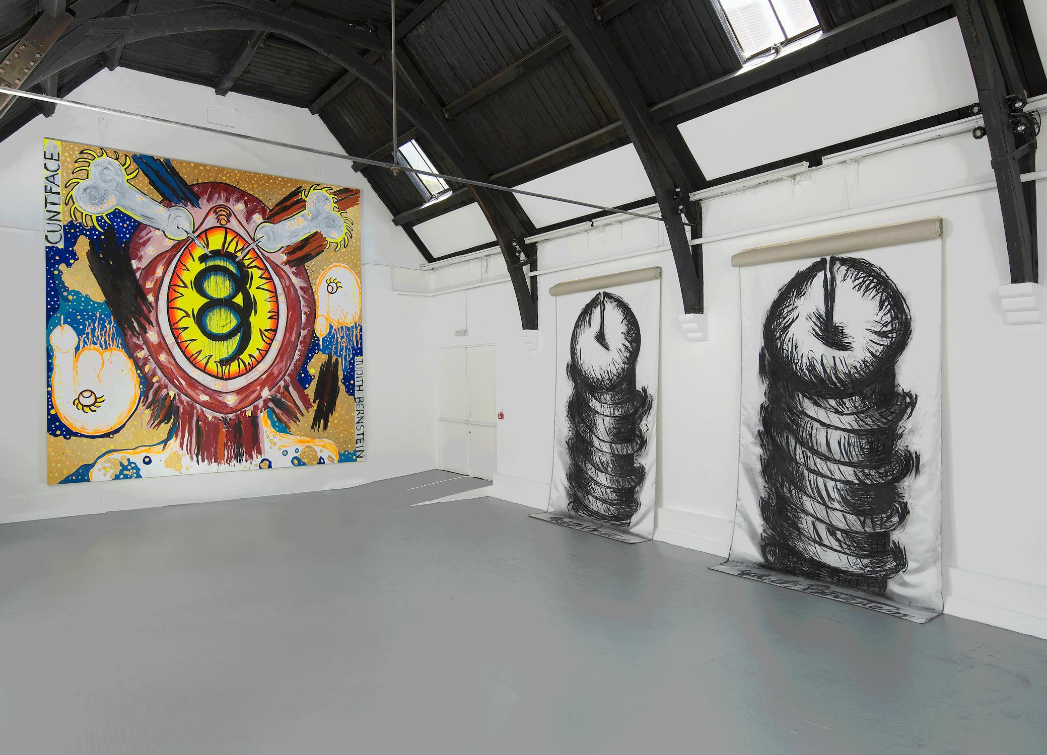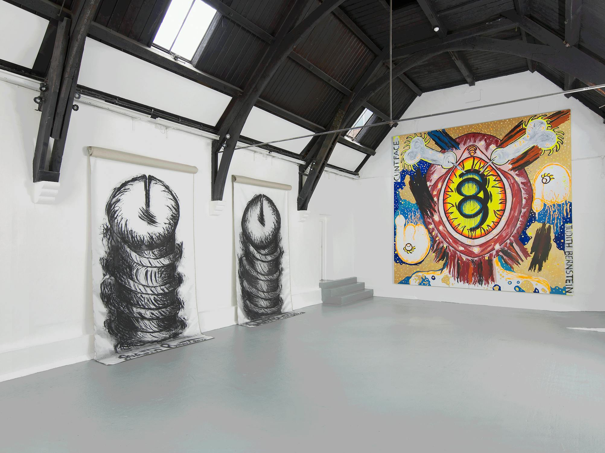 In contrast to Golden Birth of the Universe, which dominated the back wall of Studio Voltaire’s distinctive gallery space, the artist revisited her pivotal ‘screw’ works; scratched charcoal drawings of hardware screws that morph into massive phallic presences. These powerful works of feminist protest, which Bernstein first began in 1969, climbed the high walls of the vaulted gallery space, surrounding and challenging her fluorescent “cunt” painting. In the second gallery space, Bernstein presented Birth of the Universe #33, painted using fluorescent paint and exhibited in blackout light, the work completely absorbs the viewer into the physical and psychological space of the painting.