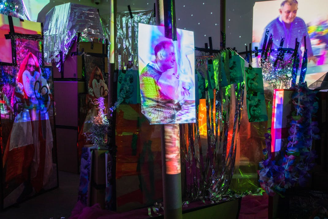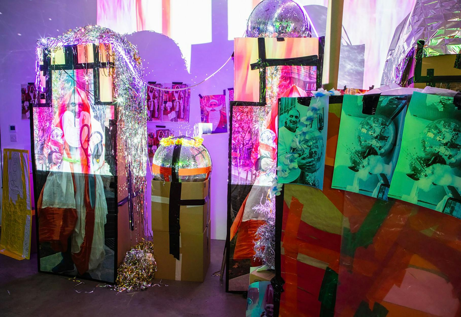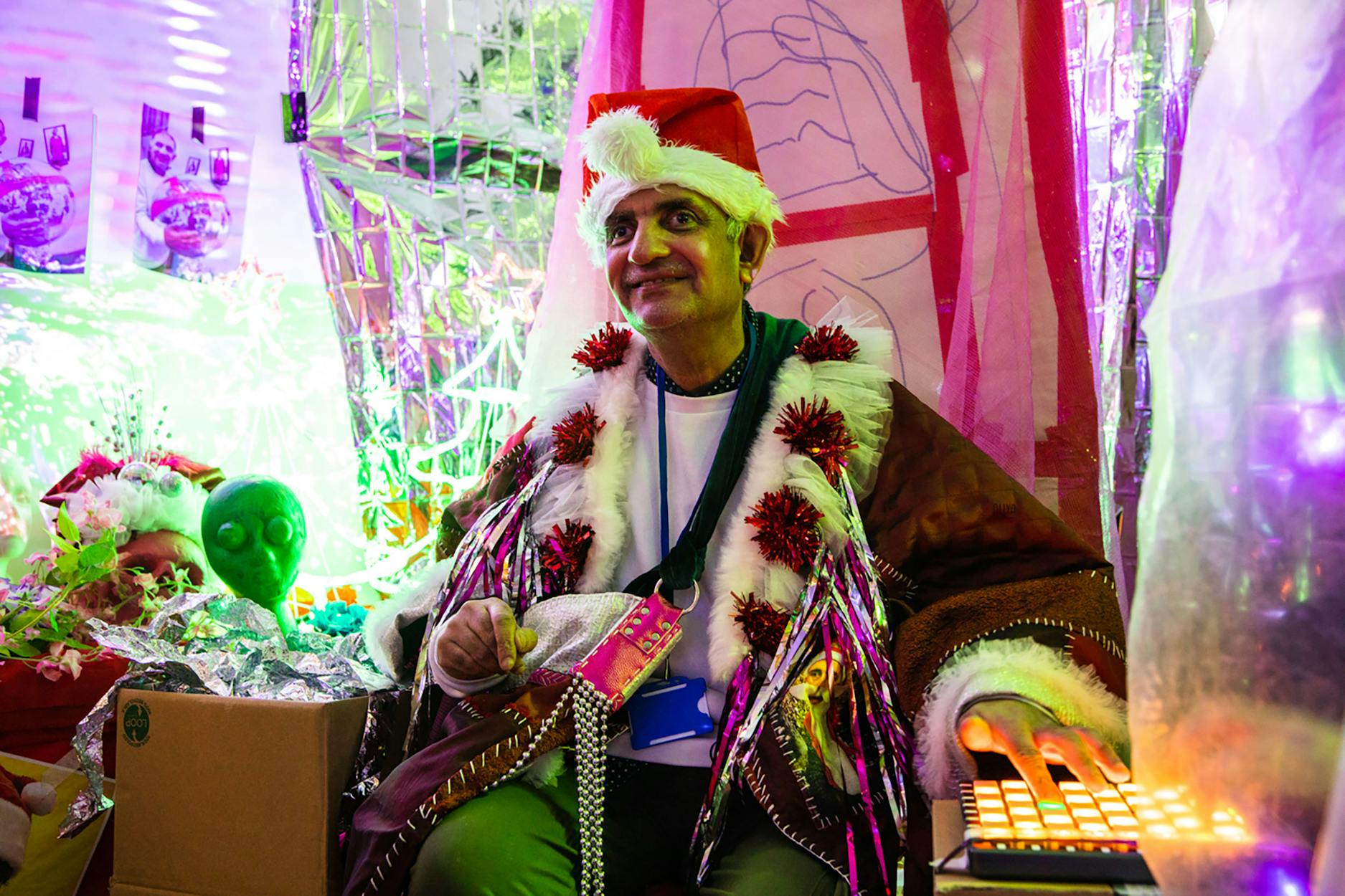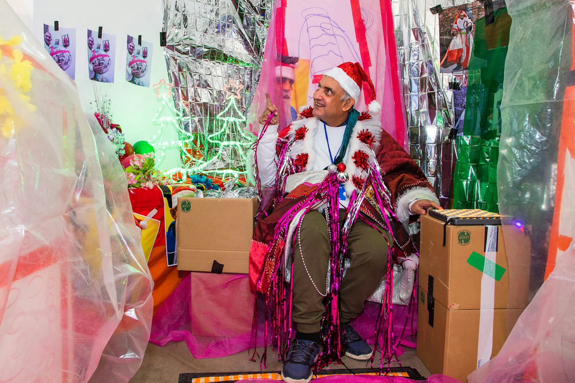 Pardip Kapil’s practice is part installation, part happening. He creates spontaneous, site-specific, temporary structures and scenes which frequently evolve with the artist as central to the work. He combines installation and impromptu performance with his eccentric hand-made costumes and props, found objects, music and projections to create multilayered experiences and moments. Essential to his practice is the public who are invited to engage with and often become part of the work. He explores the recurrent themes of celebrations, Christmas, Discos and FunFairs; reworking his ideas into many varied layouts whilst responding to the environment he’s working in. He documents his work through film and photography, recording the people and himself in his spaces often reworking the footage and images back into the next happening. Pardip’s energetic, often surreal practice is infectious and pure creativity. Since 2010 Kapil has led multiple live art events through ActionSpace’s Live Art programme including Pop Up Pardip 2018 and Tubelines 2019, Tate Exchange, Tate Modern and Pop Up Pardip’s Zoom Disco, Wandsworth Arts Fringe 2021.