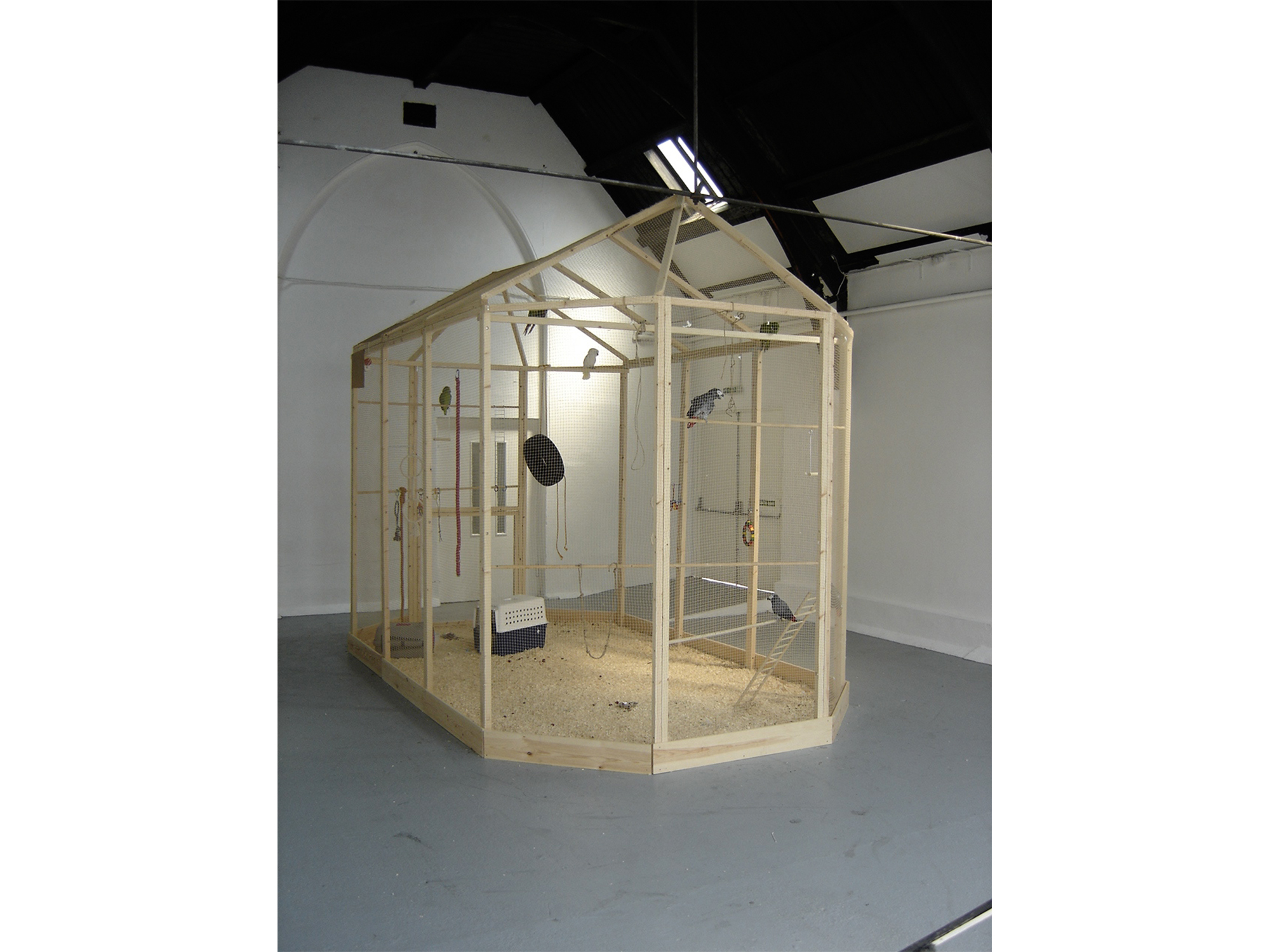 Ruth Ewan, Psittaciformes Trying to Change the World, 2006. Installation View, Studio Voltaire, London. Courtesy of the artist and Studio Voltaire, London.