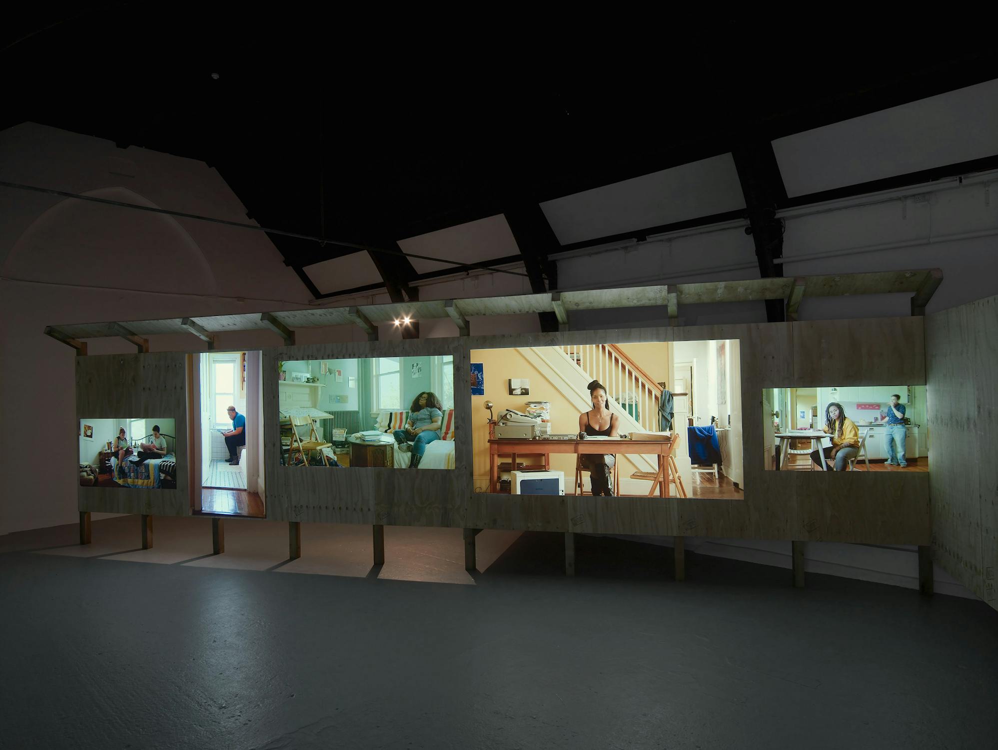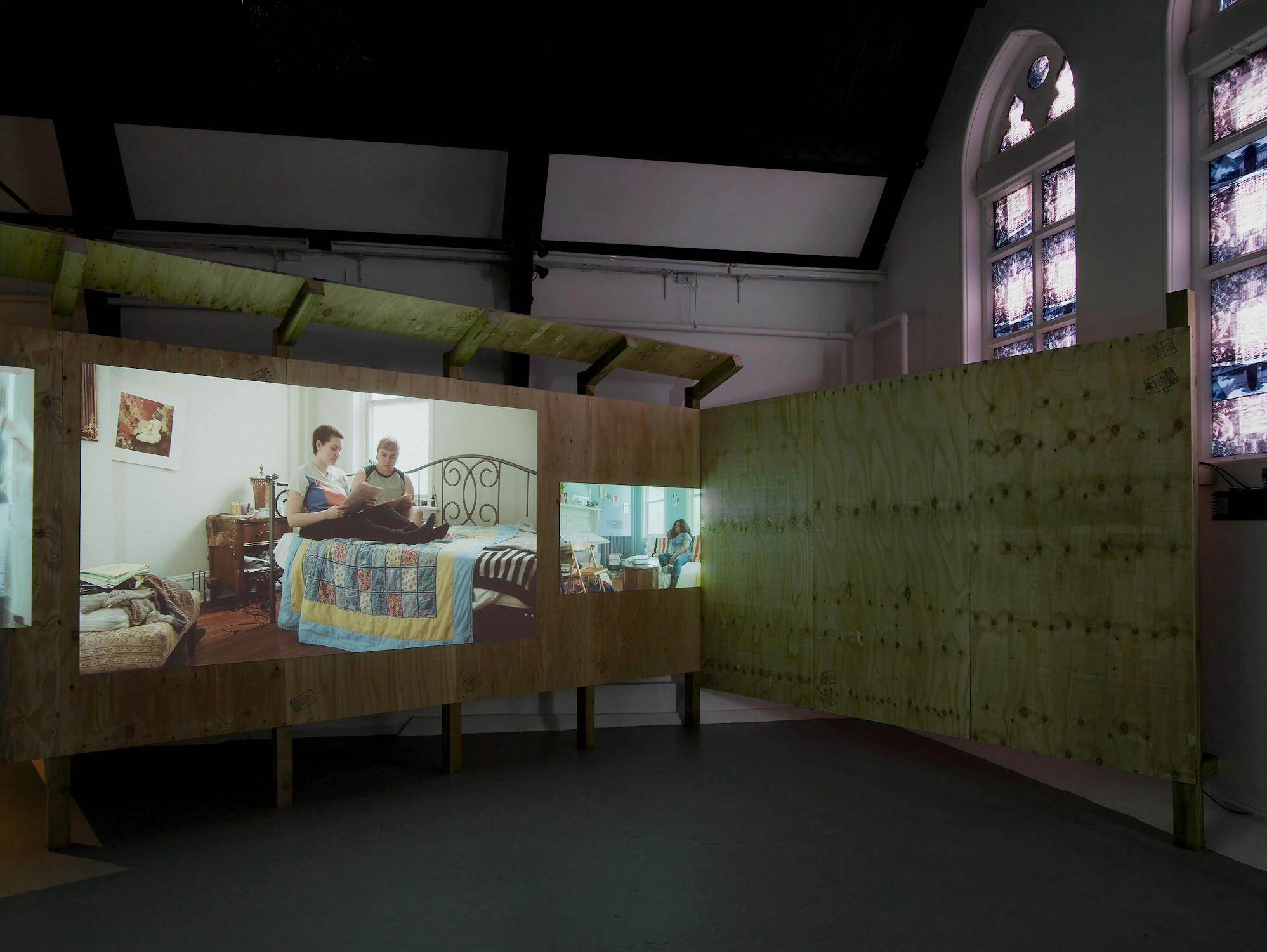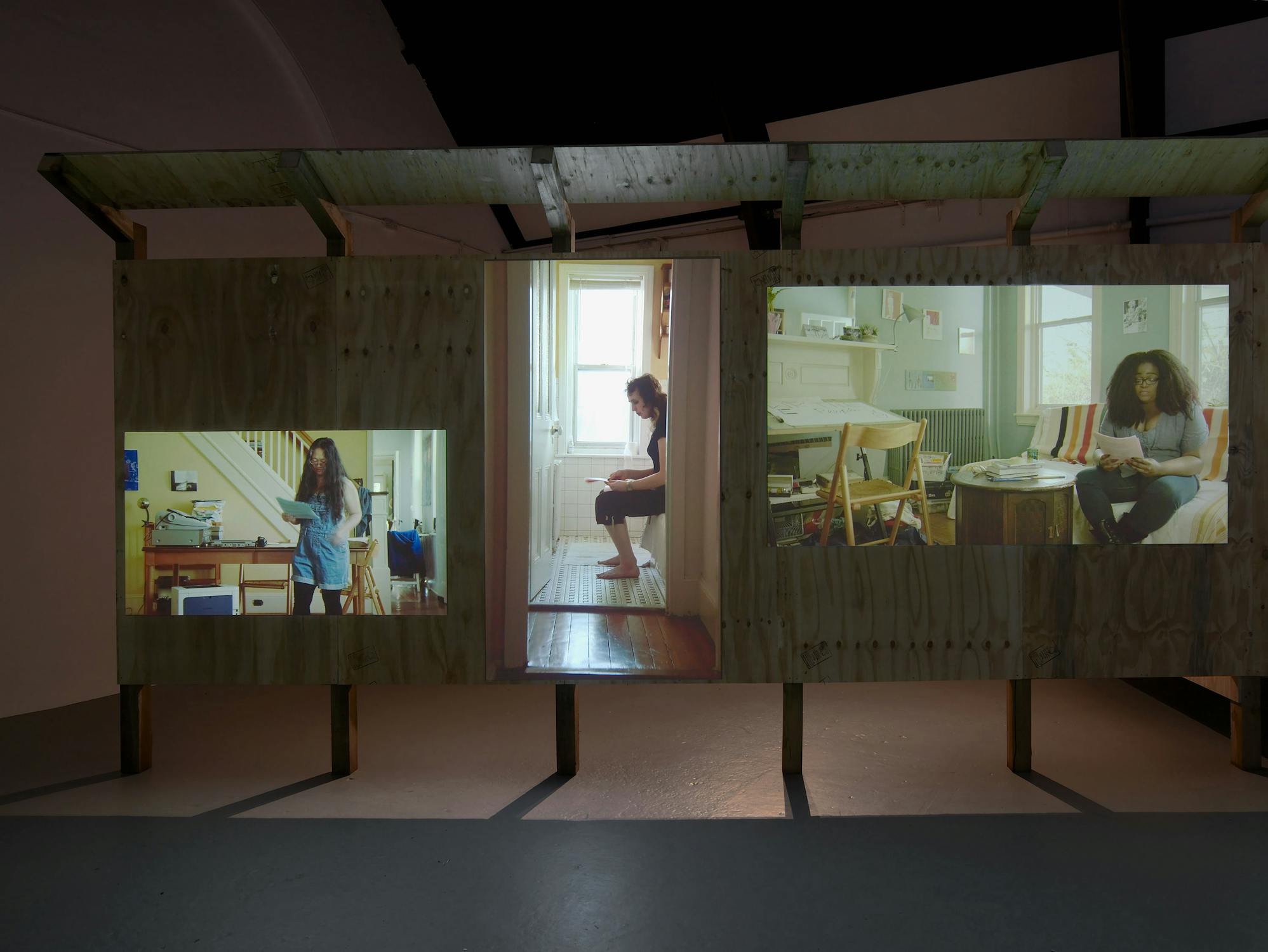 Hayes’ new work, In My Little Corner of the World, Anyone Would Love You, is a five-channel video installation projected onto a large plywood structure that bisects the gallery. Referencing hoarding and notice boards used as sites of communication for action and support groups, Hayes’ new work restages material extracted from newsletters and small-run publications produced by feminist, lesbian and effeminist political collectives in the US and UK from 1955-1977. Thirteen readers/performers, from the contemporary queer and feminist community in Philadelphia, read the texts aloud. The work draws out the complex relationships between communication and isolation, as well as marking some of the critical debates that circulated in the early formation of lesbian, feminist, lesbian-feminist and gay liberation political positions. Filmed within a domestic setting, the ‘home’ is posited as a political site, a site where politics is made, where political language was written and read and where individuals and collectives gathered the language to define their political identities and aspirations.