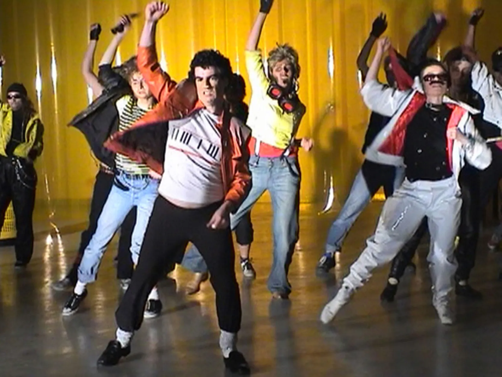 Mellor presented an extensive series of drawings of Michael Jackson the artist made when they were a teenager in the eighties; as well a precursor to Mellor’s concern with celebrities and fan culture, the drawings indicate the burgeoning sexuality and artistic ambition of the young artist. Both Chetwynd and Pask made performances based on early music videos using groups of amateurs but with different motivations. Chetwynd’s Thriller documents two performances based on Jackson’s seminal video. The reenactment acts as a D.I.Y. homage to the first music video to be made by a major Hollywood director. In contrast, Pask’s reworking of Beat shows two gangs of Lithuanian and Dutch art students acting out the dance routine as an accessible metaphor for complex political issues surrounding the entrance of countries into Europe and the subsequent formation of a new superstate. Bedwell’s adapted posters of Black musicians and pop stars plays with the semiotics of the image and text, while subtly referring to Jackson’s black heritage.