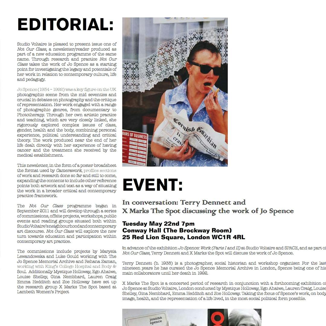 This exhibition is a part of Not Our Class, Studio Voltaire’s programme of commissions and education projects that through research and practice take the work of Jo Spence as a starting point for investigating the legacy and potentials of her work in relation to contemporary culture and life.